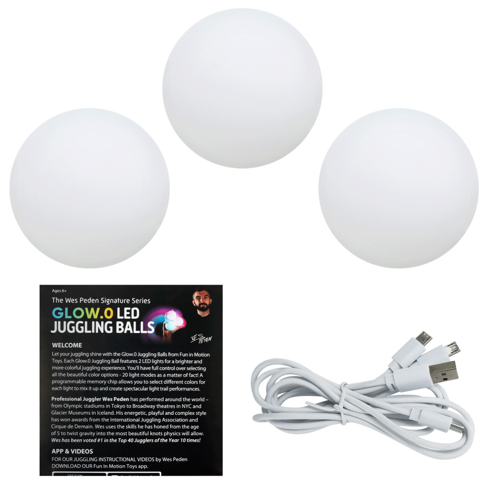 WES PEDEN SIGNATURE SERIES GLOW.O LED JUGGLING BALLS.  These fantastic soft shell  LED balls have been introduced on the US market in 2022 and immediately became very popular proving to be very nice to juggle and extremely reliable. They are dimmable and rechargeable (a 3 head  USB charging cable is included with each set as well as the instructions booklet) and feature 20 light modes! Each ball is 7cm, 120 gr. Price is for 1 ball.